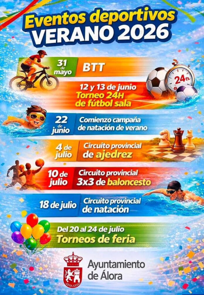 InicioÁlora eternaActualidadActividades deportivas Actividades deportivas 17 marzo, 2026 30 ¡Toma nota de las siguientes fechas deportivas! Os dejamos los eventos deportivos que nos vienen esta primavera y verano. Comparte en redes sociales Compartir FacebookXPinterestWhatsApp Artículo anteriorDiaconado de Leandro Carrasco BootelloArtículo siguienteFelipe García Medrano ARTÍCULOS RELACIONADOS Actualidad Cupón de la ONCE F.L. Carrasco Bootello - 28 marzo, 2026 Actualidad Aparcamientos F.L. Carrasco Bootello - 28 marzo, 2026 Actualidad Inauguración F.L. Carrasco Bootello - 20 marzo, 2026 ÚLTIMOS ARTÍCULOS Horarios e itinerarios (Domingo de Ramos) 28 marzo, 2026 Celebraciones parroquiales 28 marzo, 2026 Caída accidental 28 marzo, 2026 Cupón de la ONCE 28 marzo, 2026 Cargar más