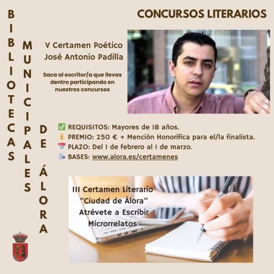 La Concejalía de Cultura del Ayuntamiento de Álora, a través de las Bibliotecas Públicas Municipales, convoca el III Certamen Literario Ciudad de Álora “Atrévete a Escribir Microrrelatos” y el V Certamen Poético José Antonio Padilla, con motivo de la celebración del Día Internacional del Libro.