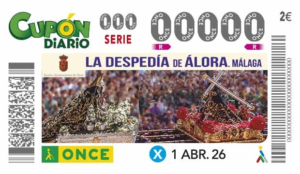 InicioÁlora eternaActualidadCupón de la ONCE Cupón de la ONCE 28 marzo, 2026 12 El Cupón Diario de la ONCE para este Miércoles Santo, 1 de abril llevará una foto de ‘La Despedía’, Fiesta de Interés Turístico Nacional de Andalucía y de Singularidad Turística Provincial. Comparte en redes sociales Compartir FacebookXPinterestWhatsApp Artículo anteriorAparcamientosArtículo siguienteCaída accidental ARTÍCULOS RELACIONADOS Actualidad Aparcamientos F.L. Carrasco Bootello - 28 marzo, 2026 Actualidad Inauguración F.L. Carrasco Bootello - 20 marzo, 2026 Actualidad Sábados flamencos F.L. Carrasco Bootello - 20 marzo, 2026 ÚLTIMOS ARTÍCULOS Horarios e itinerarios (Domingo de Ramos) 28 marzo, 2026 Celebraciones parroquiales 28 marzo, 2026 Caída accidental 28 marzo, 2026 Aparcamientos 28 marzo, 2026 Cargar más